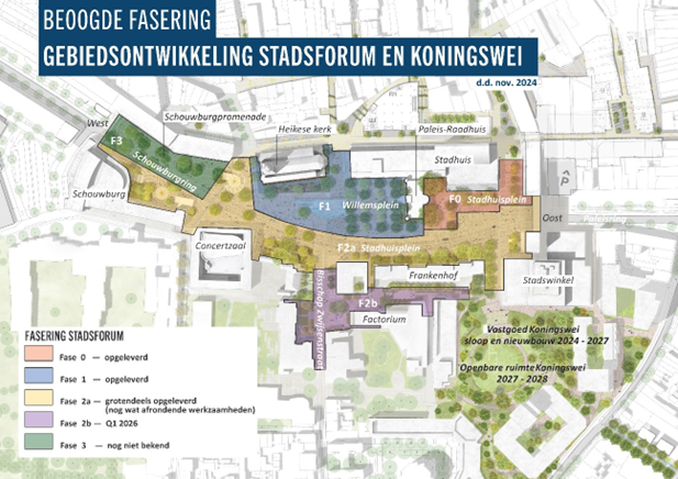 - Stadsforum fase 3 (Schouwburgring) , het ontwerpbureau heeft de afgelopen periode gewerkt aan het ontwerp van fase 3 Stadsforum, het ontwerp is inmiddels grotendeels afgerond en voorgelegd aan zowel de omgevingscommissie als het planteam. Het raadsvoorstel voor het uitvoeringskrediet zit inmiddels ook in de cyclus en zal in december 2025 worden voorgelegd aan de raad. De verwachting is dat in het eerste kwartaal van 2026 de kiosken en de aangesloten luifel worden gesloopt, waarna fase 3 van het Stadsforum kan worden uitgevoerd. Stadsforum wordt integraal opgepakt met de Parkring West door dezelfde aannemer in de uitvoering. De precieze uitvoeringsdatum is nog niet bekend;