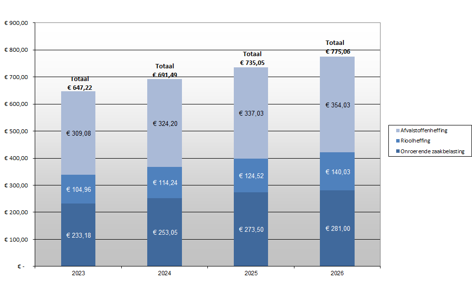De ontwikkeling van de woonlasten voor een meerpersoonshuishouden is in onderstaande tabel opgenomen. Ten opzichte van 2025 zijn de woonlasten met € 40 gestegen.